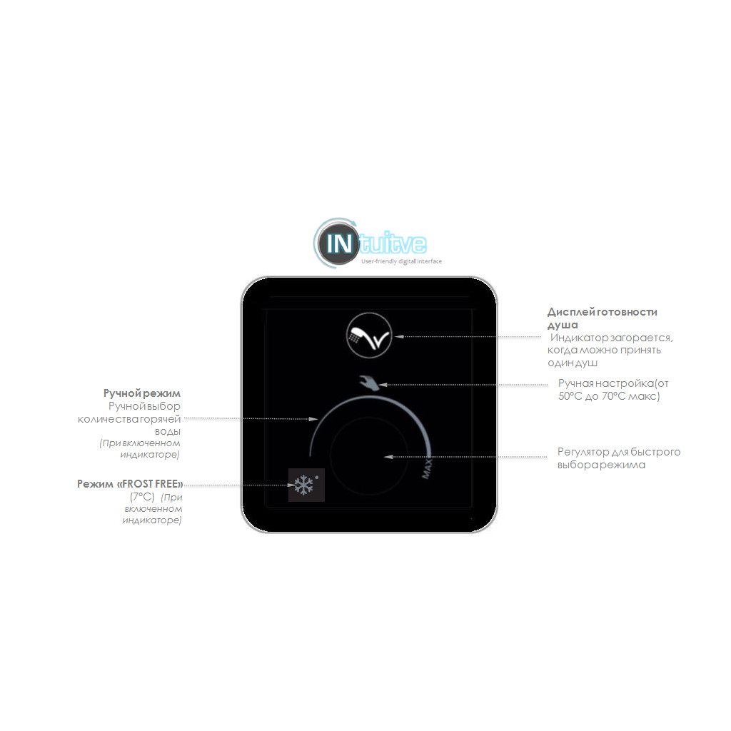 Управлять работой бойлера интуитивно понятно и легко. Для смены режима нагрева просто прокрутите ручку регулировки влево или вправо, выбирая нужный режим. А для активации ускоренного нагрева воды – нажмите кнопку Boost.